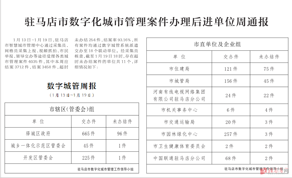 驻马店市数字化城市管理案件办理后进单位周通报