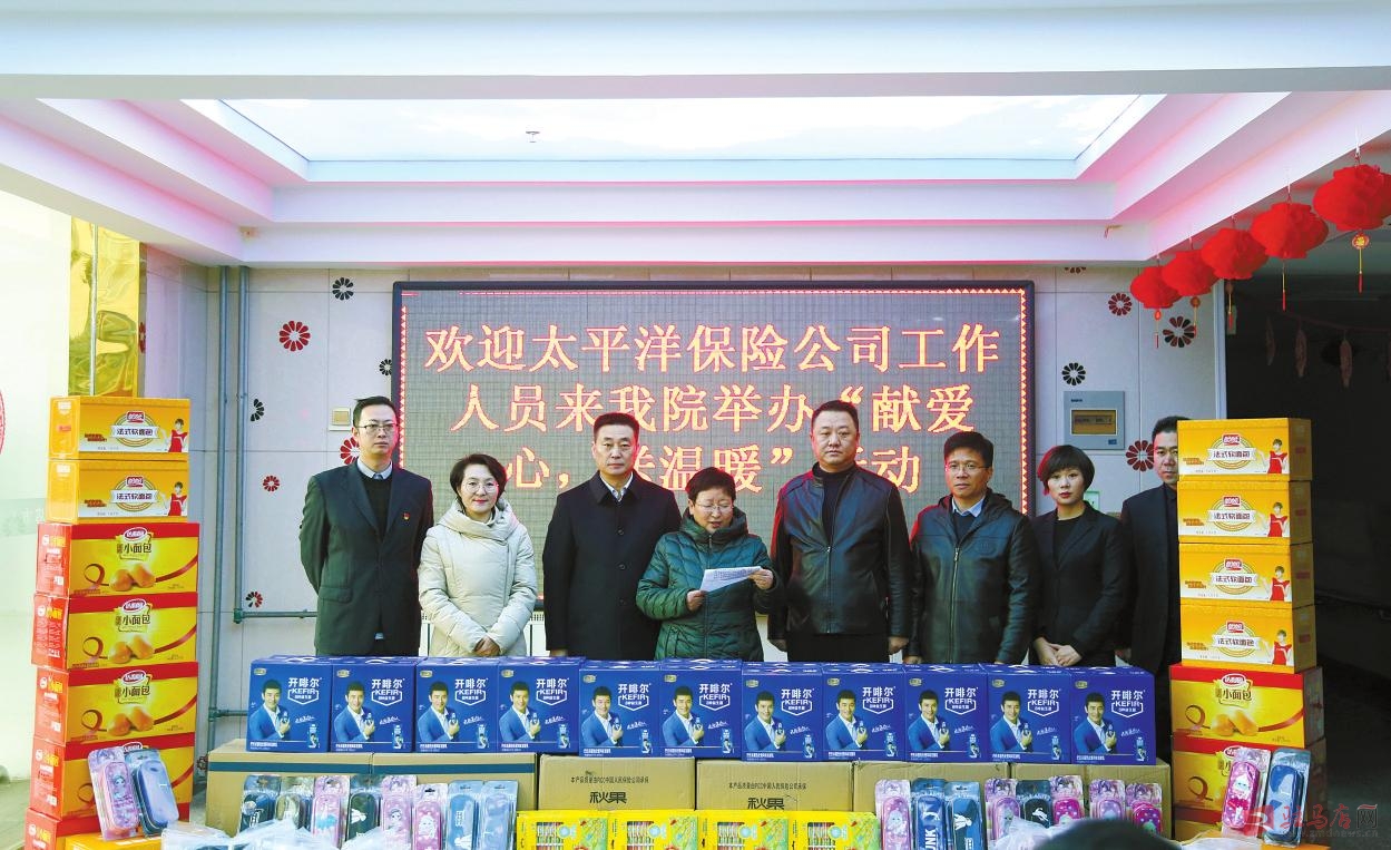 1月16日,市保险行业协会联合太平洋财险、太平洋人寿驻马店中心支公司赴市儿童福利院开展捐赠、慰问活动,为孩子带去生活用品和食品。记者李小龙摄