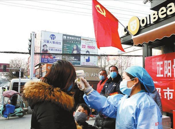 日前,正阳县党员志愿者在卡点为群众测体温。记者 弓华静 摄