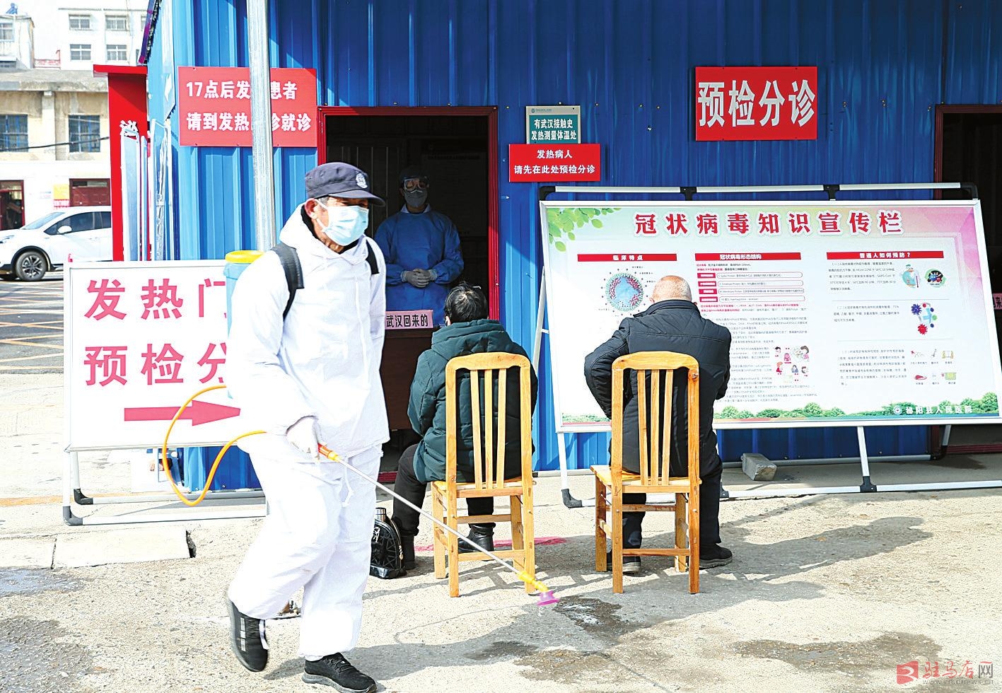 2月1日,在泌阳县人民医院发热门诊前,工作人员正在进行环境消杀。 记者弓华静摄