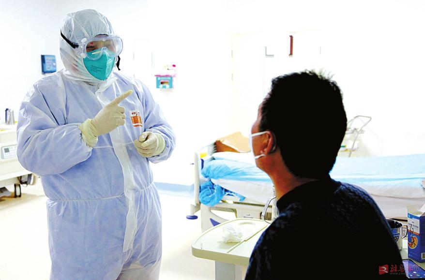 隔离病房内,市中心医院呼吸重症医学科主任王运正在为患者分析病情,安抚患者。