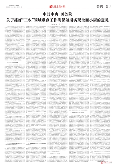 中共中央 国务院关于抓好“三农”领域重点工作确保如期实现全面小康的意见