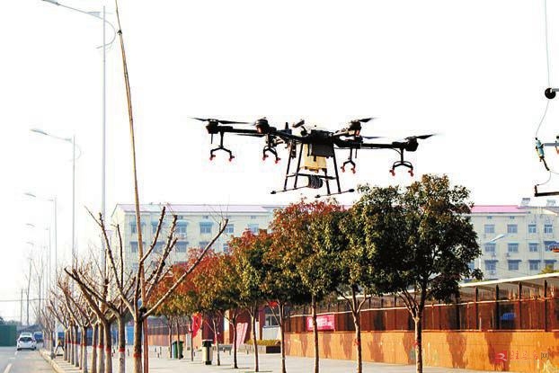 近日,汝南县古塔街道办事处三里店社区在用无人机消毒。 记者 刘仁忠 通讯员 王付云 摄影报道