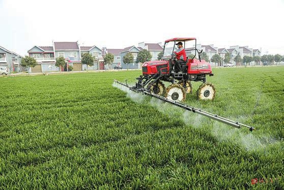 2月12日,河南省平顶山市宝丰县赵庄镇袁庄村村民驾驶农业机械为麦田喷洒除草剂。