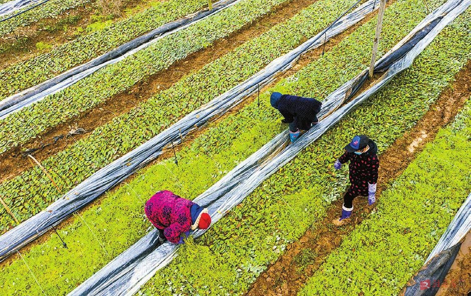 2月12日,在安徽省合肥市庐江县柯坦镇分水村的茶叶育苗基地,茶农在给茶苗除草、间苗(无人机照片)。