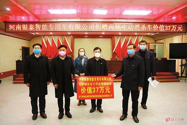为进一步支持驿城区疫情防控工作,市青年商会秘书长组织河南银泰智能专用车有限公司董事长向驿城区红十字会捐赠两辆电动多功能防疫消杀车。该车型是河南银泰智能专用车有限公司针对城市重大疫情事件而设计的紧急清洁消毒消杀移动专用设备,可对居民点、医院、车站广场、背街小巷等重点疫情防控区域进行“无死角、无盲区、全覆盖”雾化喷洒消毒。该公司具备年产1.5万辆新能源专用汽车和环卫作业机器人的能力,2018年获得新能源专用汽车生产资质,目前产品覆盖新能源市政环卫车辆、环境监测及防疫消杀车辆、新能源物流车辆三大系列26个品种,是国家高新技术企业、河南省新能源专用汽车重点生产企业。
