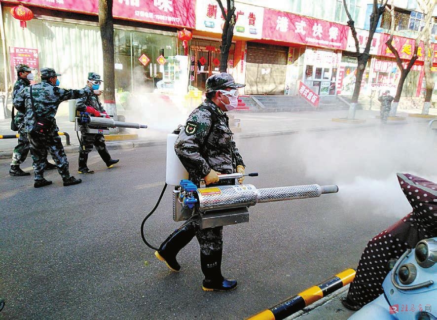 2月11日上午,在驿城区西园街道驿城新村居民小区,驻马店市蛟龙救援队队员身背弥雾机正在义务对该居民小区进行喷洒消毒。