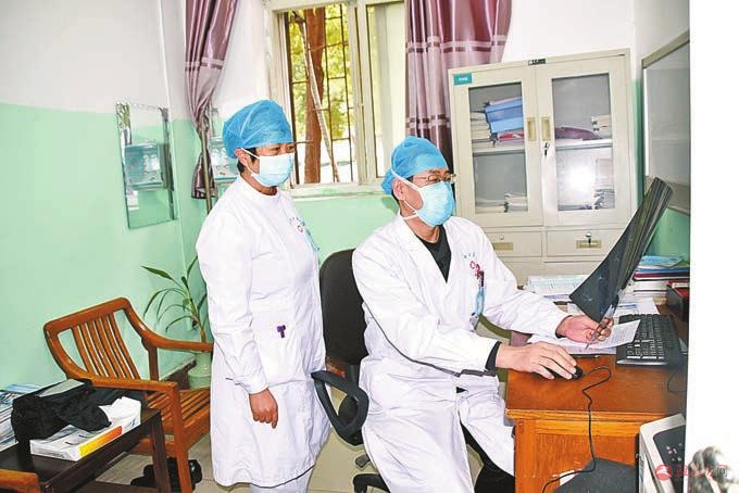 2月13日,市级专家组成员、重症成人救治组成员、儿童重症救治组成员、市中心医院放射科主任医师代向党(右一)在看患者图像,分析其病症。