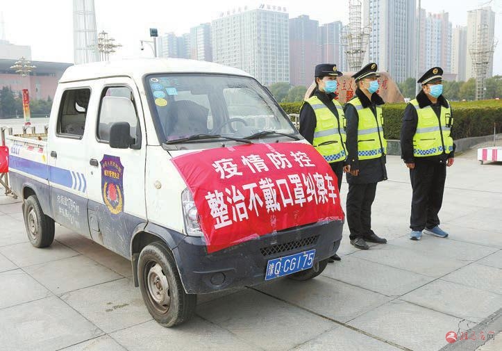 2月13日,驻马店市城市管理局城管执法支队的执法人员在街头执勤,对不戴口罩、戴口罩不规范、随地吐痰、众人集聚等行为进行纠察。