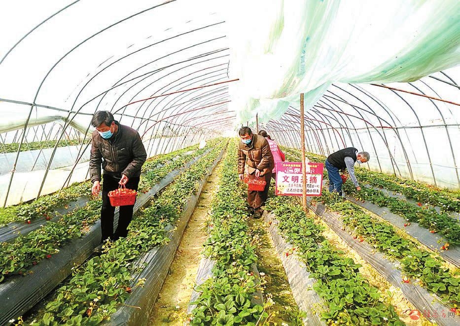 2月14日,市天中生态农业科技有限公司种植园内,工人们正在采摘草莓。