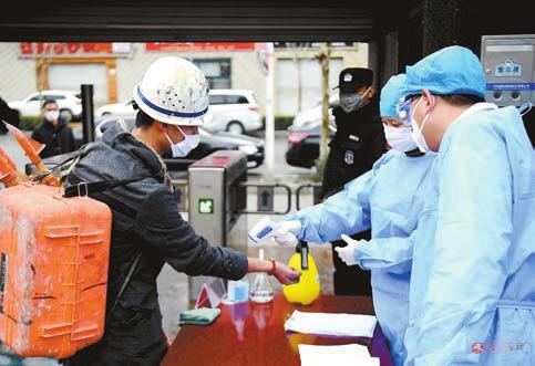 2月14日,在石家庄市儿童医院建设工地,复工人员接受体温测量。 新华社 记者 王晓 摄