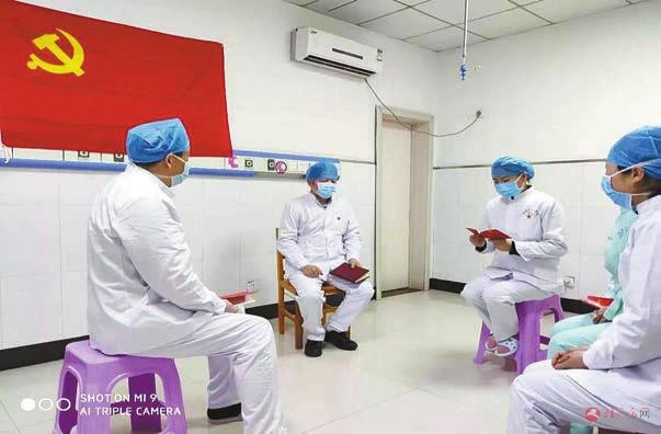 近日,在汝南县人民医院感染性疾病科,临时党支部委员、部分医护人员会聚一起召开党员会议,重温入党誓词。