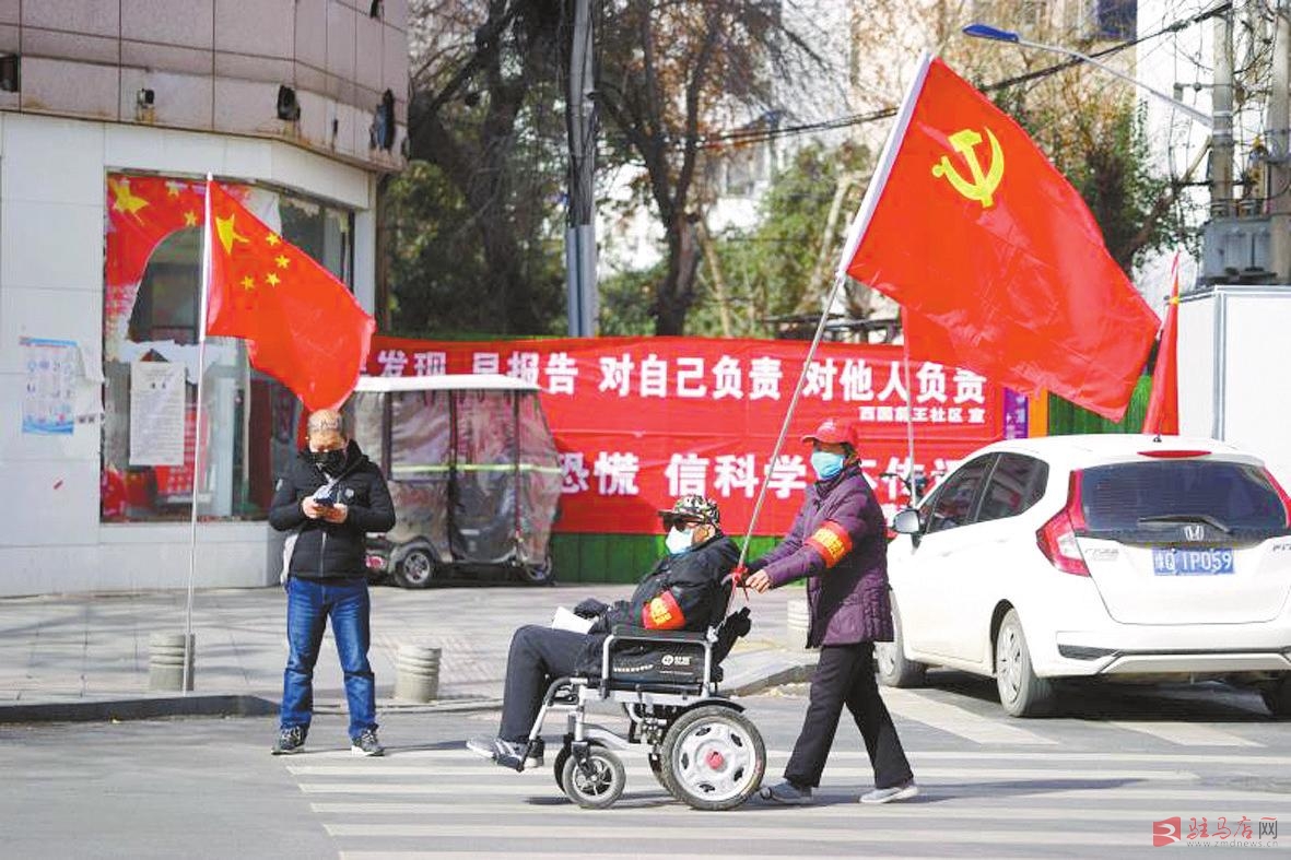 驿城区西园街道老党员志愿者孙大轩坐在轮椅上宣传防控知识。