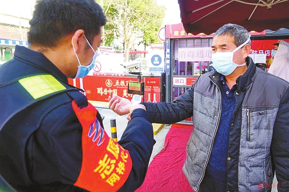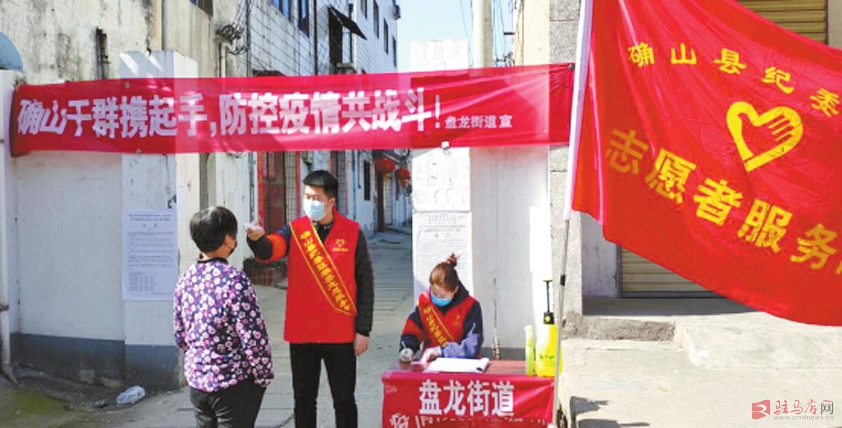 确山县纪委志愿者在盘龙街道为居民测量体温。