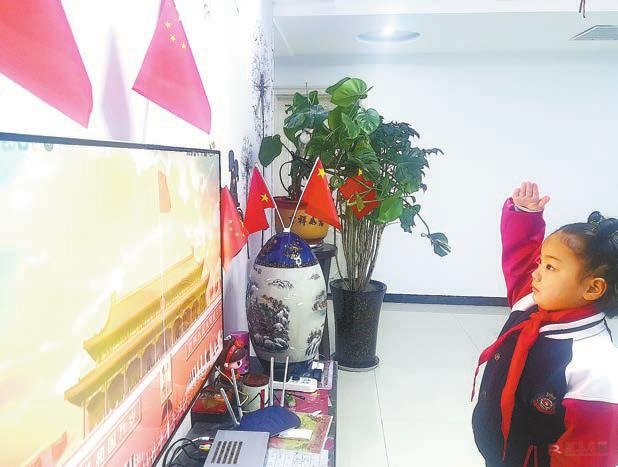 3月2日,星期一,早晨8时,市实验小学北区二年级九班学生杨梓,在家中面对电视机里的国旗,举起右手向国旗行礼,唱着国歌,目视国旗冉冉升起。疫情防控期间,学生不能到学校上课,按照上级停课不停学的要求,我市开通网络教学。