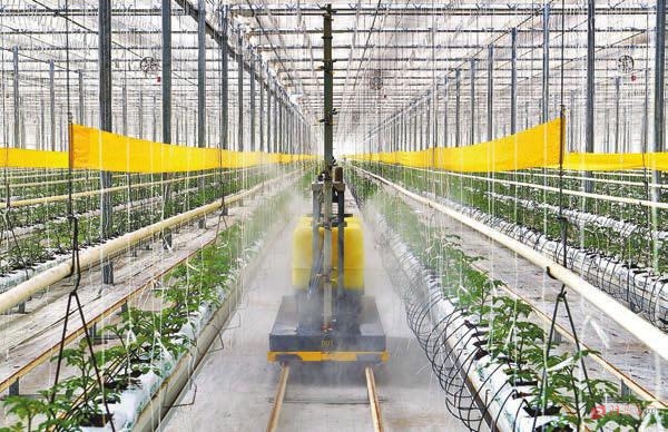 3月3日,自动喷药机在格子头村的玻璃温室大棚内为西红柿苗喷洒农药。