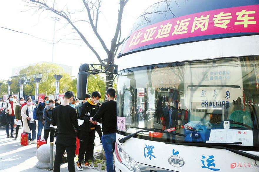 3月4日,4辆广东深圳牌照的大巴车停靠在市世纪广场大门前,来自我市各县区的100多名比亚迪员工在这里等候乘车返岗。