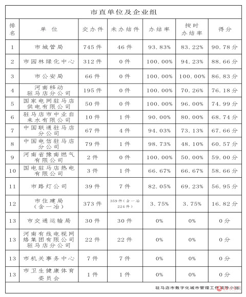 2020年2月份,驻马店市智慧城市管理中心通过采集员、网格员采集上报、视频抓拍、市民举报、领导交办等途径受理各类城市管理案件4209件,其中本月应结案4200件,已结案3607件,超时未办结1008件,因确权争议未处置案件共125件,结案率73.02%。所有案件均通过数字城管系统派遣交办至18个联动单位,现将2月份市中心城区数字化城市管理工作考评排名情况通报如下: