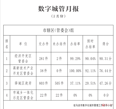 驻马店市中心城区2月份数字化城市管理工作考评排名情况通报