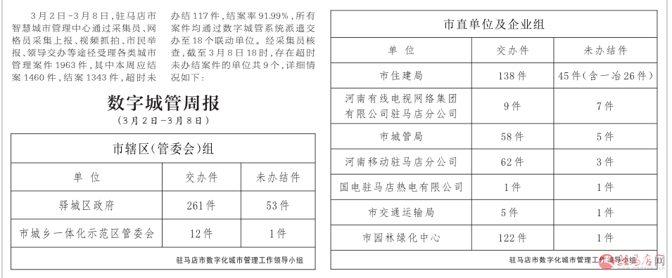 驻马店市数字化城市管理案件办理后进单位周通报