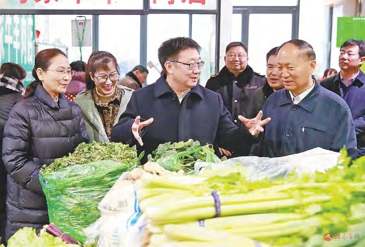 副市长贺振华(前排居中)在农贸市场询问蔬菜价格稳定情况。