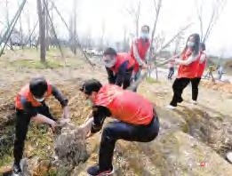 3月11日,志愿者在浙江省台州市路桥区桐屿街道春泽社区进行义务植树。