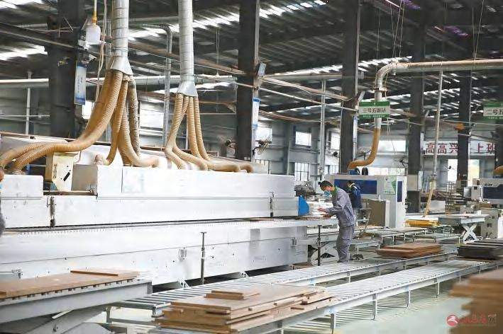 3月11日,平舆县在做好疫情防控的同时,推动企业复工复产,稳定就业岗位。图为河南中鑫家具有限公司工人正在生产车间里加工订单。