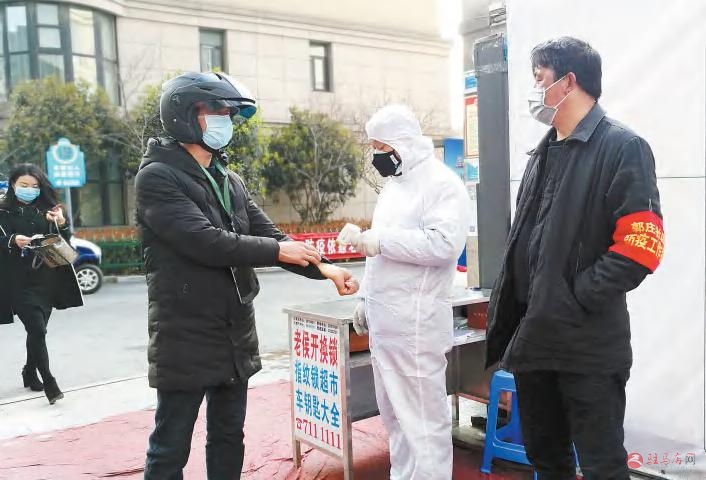 3月11日,在开发区金河办事处郭庄社区鹏宇天下城小区,防控人员为出小区的业主测量体温。疫情发生以来,鹏宇天下城小区始终严格坚持进出人员登记、体温测量、公共场所消毒等措施,毫不放松抓防控,筑牢疫情防控的最后一道防线。