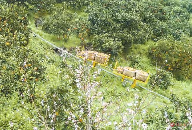 3月13日,在秭归县水田坝乡同胜家庭农场,田间单轨运输车在转运脐橙。