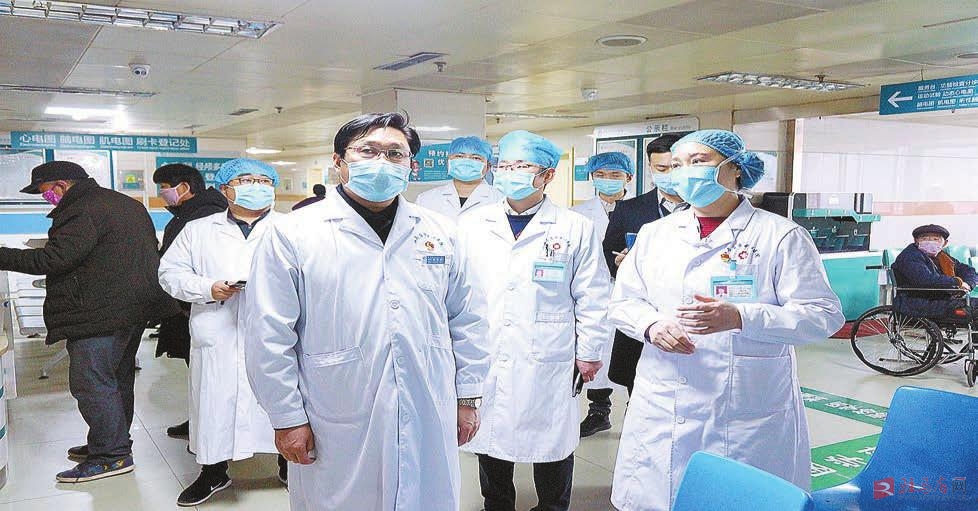 市中心医院党委书记、院长杨长虹(左一)查看门诊就诊情况。