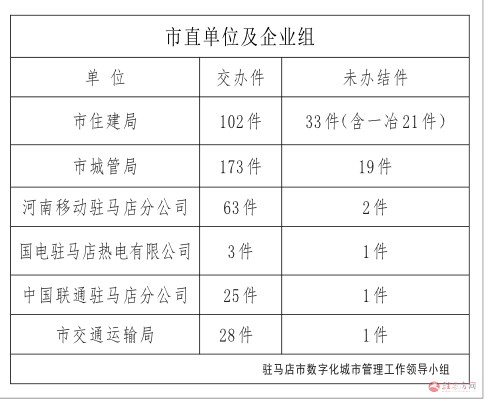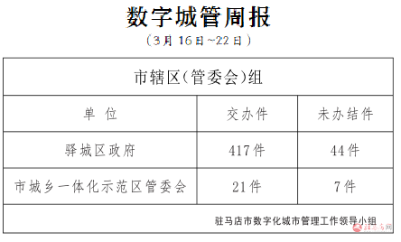 3月16日~22日,驻马店市智慧城市管理中心通过采集员、网格员采集上报、视频抓拍、市民举报、领导交办等途径受理各类城市管理案件2254件,其中本周应结案2088件,结案1980件,超时未办结108件,结案率94.83%,所有案件均通过数字城管系统派遣交办至18个联动单位。经采集员核查,截至3月22日18时,存在超时未办结案件的单位共8个,详细情况如下: