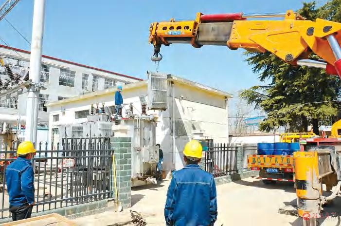 3月22日,上蔡县供电公司在做好疫情防控的同时,利用供电低谷时段,组织员工在35千伏朱里变电站,将原来10000千伏安的1号主变,更换为16000千伏安的变压器,同时将退出的10000千伏安变压器用于35千伏大路李变电站,为朱里镇、大路李乡用电户夏季用电稳定提供可靠保障。图为员工在35千伏朱里变电站更换1号主变。