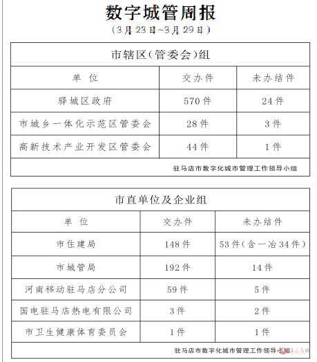 3月23日~3月29日,驻马店市智慧城市管理中心通过采集员、网格员采集上报、视频抓拍、市民举报、领导交办等途径受理各类城市管理案件2301件,其中本周应结案2276件,结案2173件,超时未办结103件,结案率95.47%,所有案件均通过数字城管系统派遣交办至18个联动单位。经采集员核查,截至3月29日18时,存在超时未办结案件的单位共8个,详细情况如下: