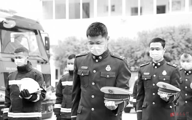 4月4日,湖北武当山消防救援大队队员脱帽默哀。