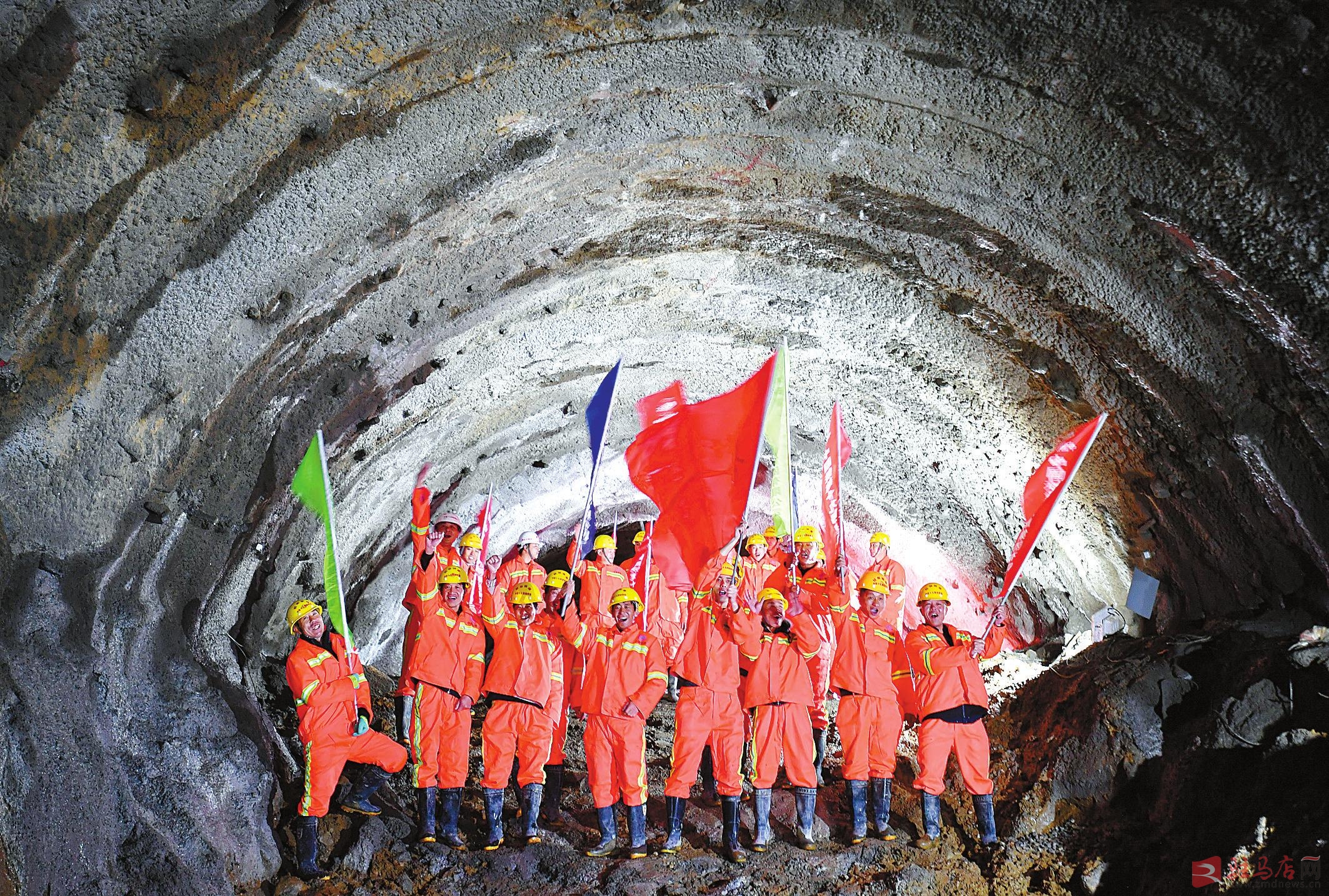 施工人员庆祝川藏铁路拉林段米林隧道贯通。