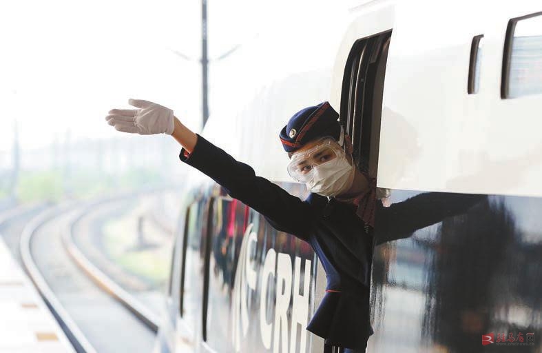 4月8日,在武汉站,G431次列车乘务员在发车前向乘客挥手。
