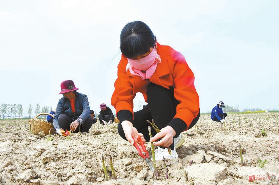 4月7日,在正阳县傅寨乡程耕家庭农场,种植户正在采收芦笋。近年来,该合作社采取“特色基地+合作社+贫困户+电商”的种植管理模式,不断发展芦笋、冰莲等有机蔬菜种植,吸纳了附近36户贫困户入股,抱团发展,签订种植回收合同,实现共同增收致富。
