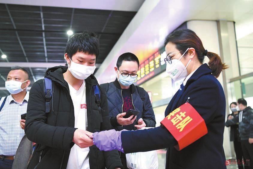 4月8日,铁路工作人员在重庆北站出站口专用通道指引武汉入渝旅客出站。