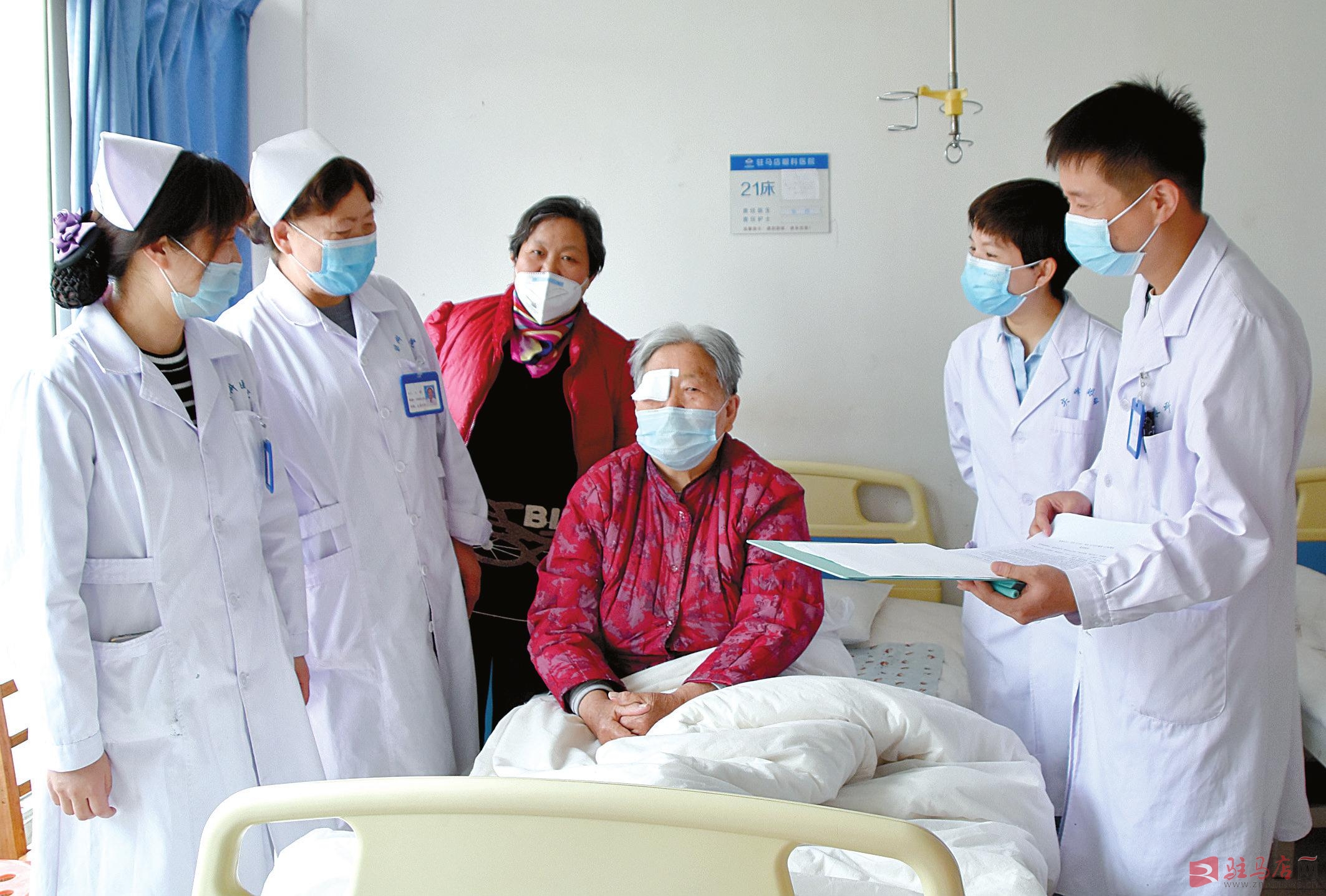 术后康复的邱天惠老人在与驻马店眼科医院的医护人员开心交流。