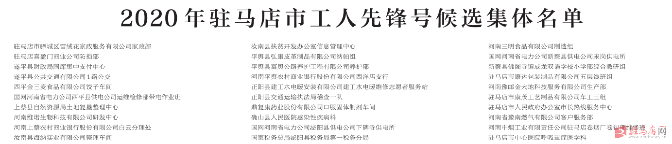2020年驻马店市五一劳动奖状候选单位名单