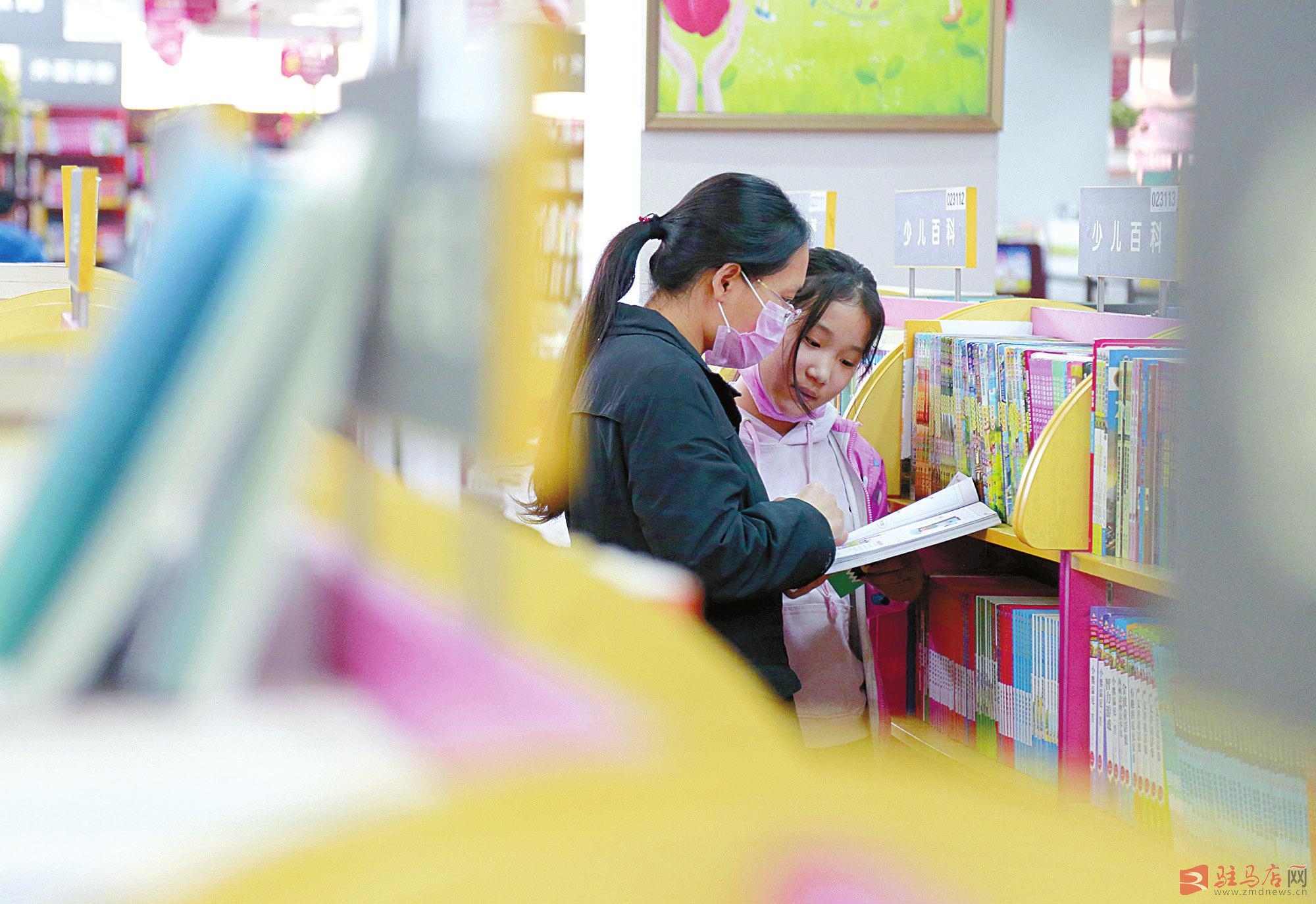 4月21日,一对母女在市新华书店天中书城挑选书籍。为迎接4月23日第二十五个世界读书日的到来,方便读者前来挑选和阅读图书,感受阅读的魅力,市新华书店员工在天中书城更新了大量图书。记者吴波摄