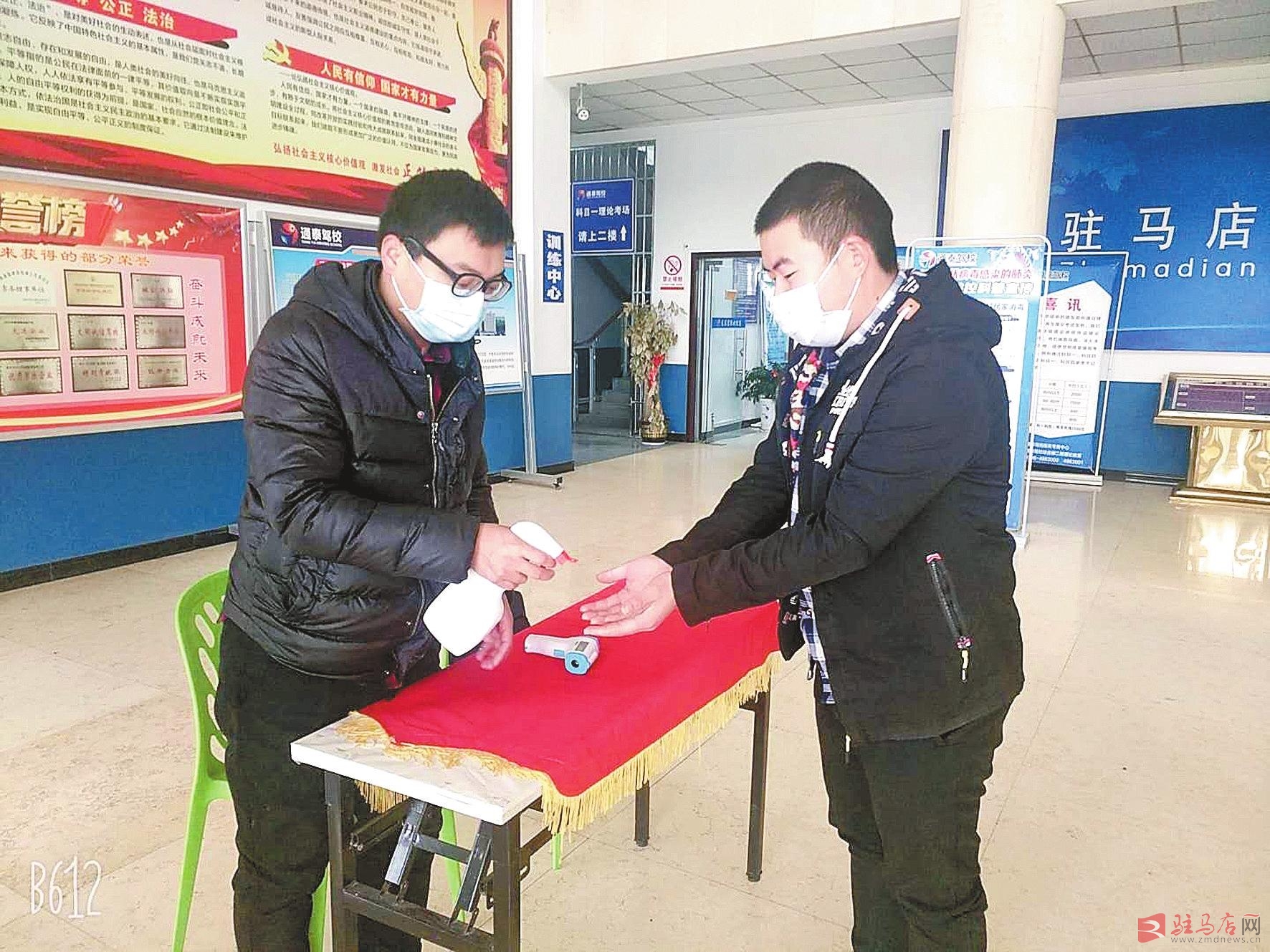 “请把双手伸开消毒、测量体温。”4月23日,记者在驻马店通泰大型机动车驾驶员培训有限公司看到,工作人员正在对出入学员严格落实防疫措施。
