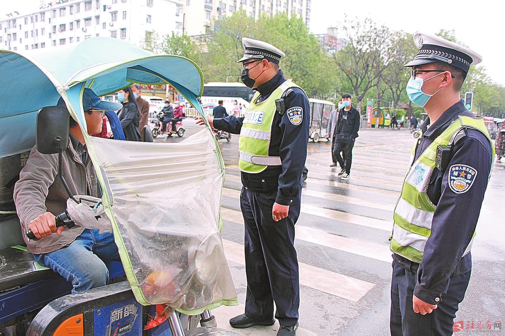 疫情防控工作开展以来,市公安局老街分局精心组织、严密部署,扎实做好防风险、护安全、战疫情、保稳定等工作,助力复工复产。图为辅警在对违法骑行人员进行宣传教育。记者吴胜军摄