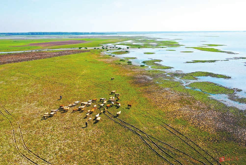 4月25日,牛群在汝南县罗店镇宿鸭湖湿地悠闲地吃草、憩息。