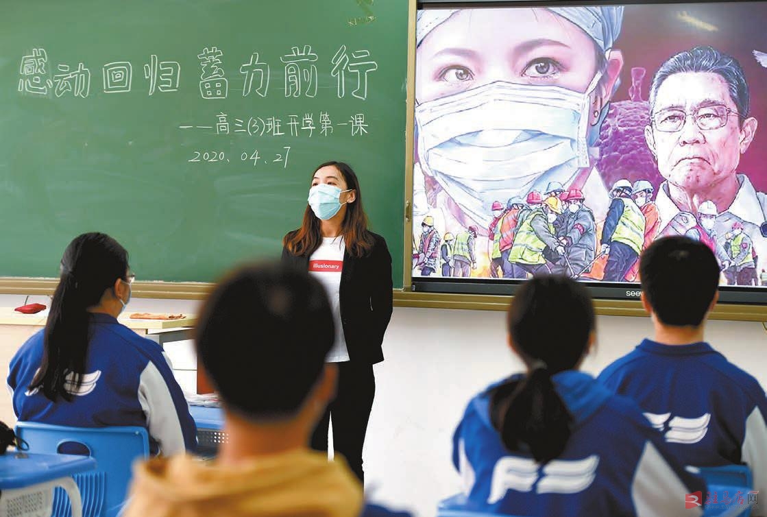 4月27日,北京市丰台二中高三年级3班的班主任为学生讲开学第一课。当日,北京市高三年级学生开学复课。