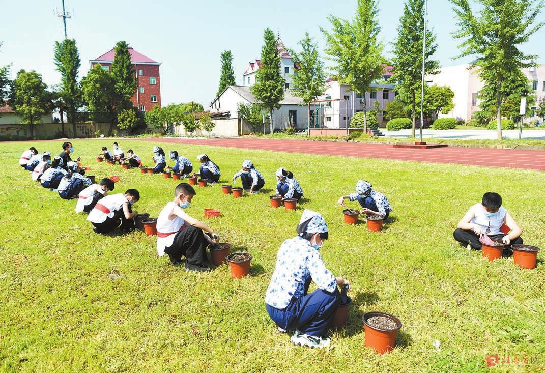 五一国际劳动节来临之际,浙江省诸暨市姚江镇上联小学在严格防疫的同时,分班错时开展农耕劳作专题实践活动。