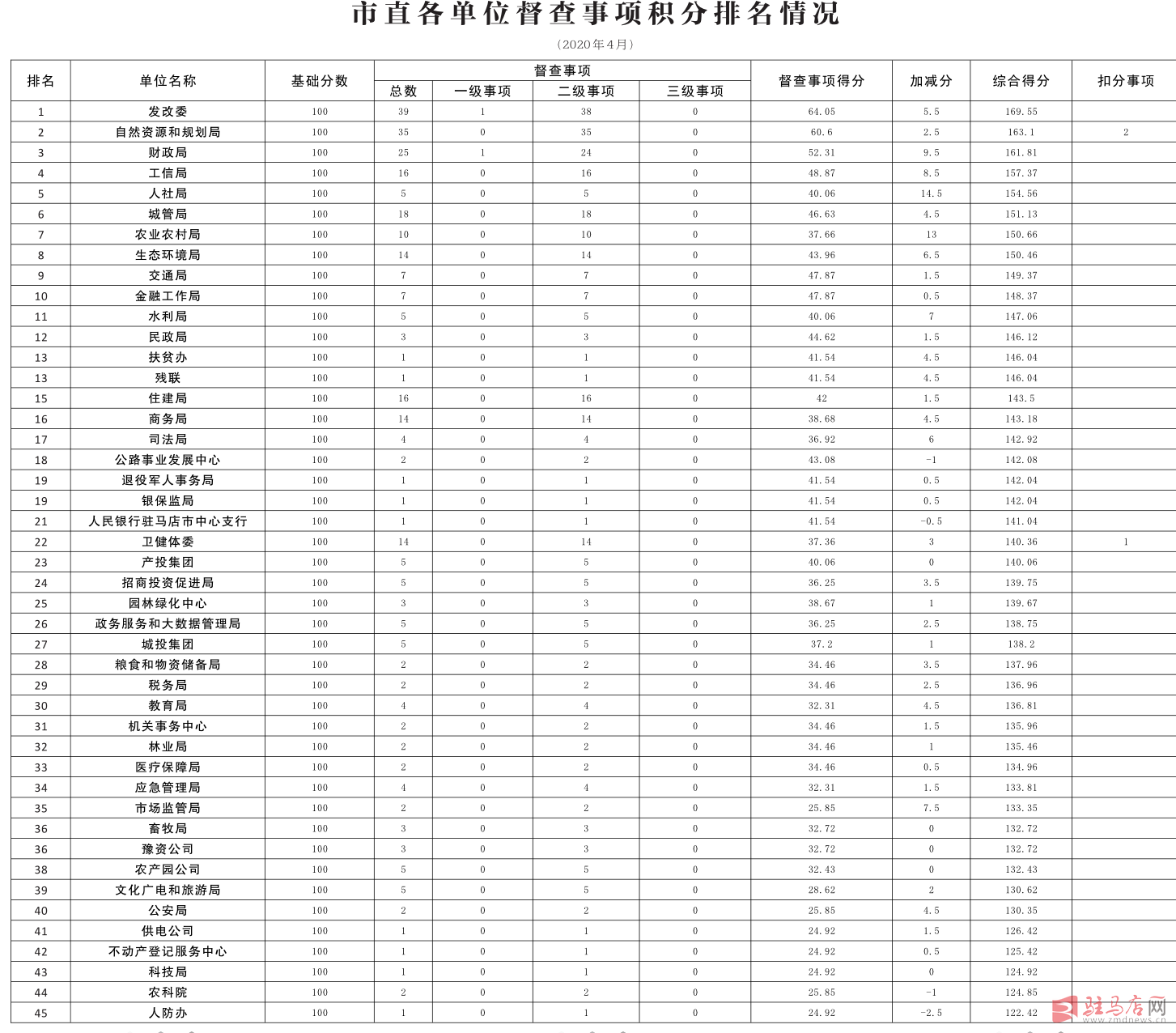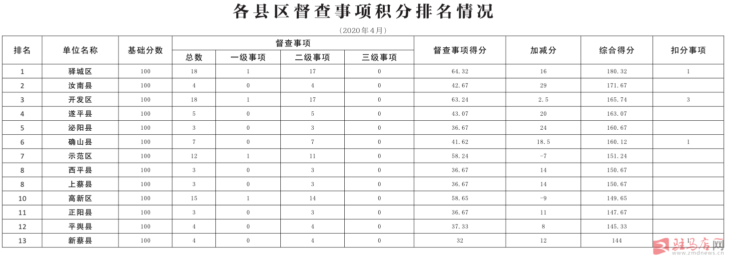 为贯彻落实市政府提出的“干成事是硬道理”的工作准则和“行动迅速、善抓落实、勇争一流、廉政为民”的行为准则,按照《驻马店市人民政府办公室关于进一步加强督查工作推动政府工作高效落实的通知》(驻政办〔2018〕1号)和《驻马店市人民政府办公室关于完善督查事项积分管理工作制度的通知》(驻政办〔2019〕8号)文件要求,市政府对督查事项实行积分管理,坚持一月一汇总,一月一排名,一月一公布。