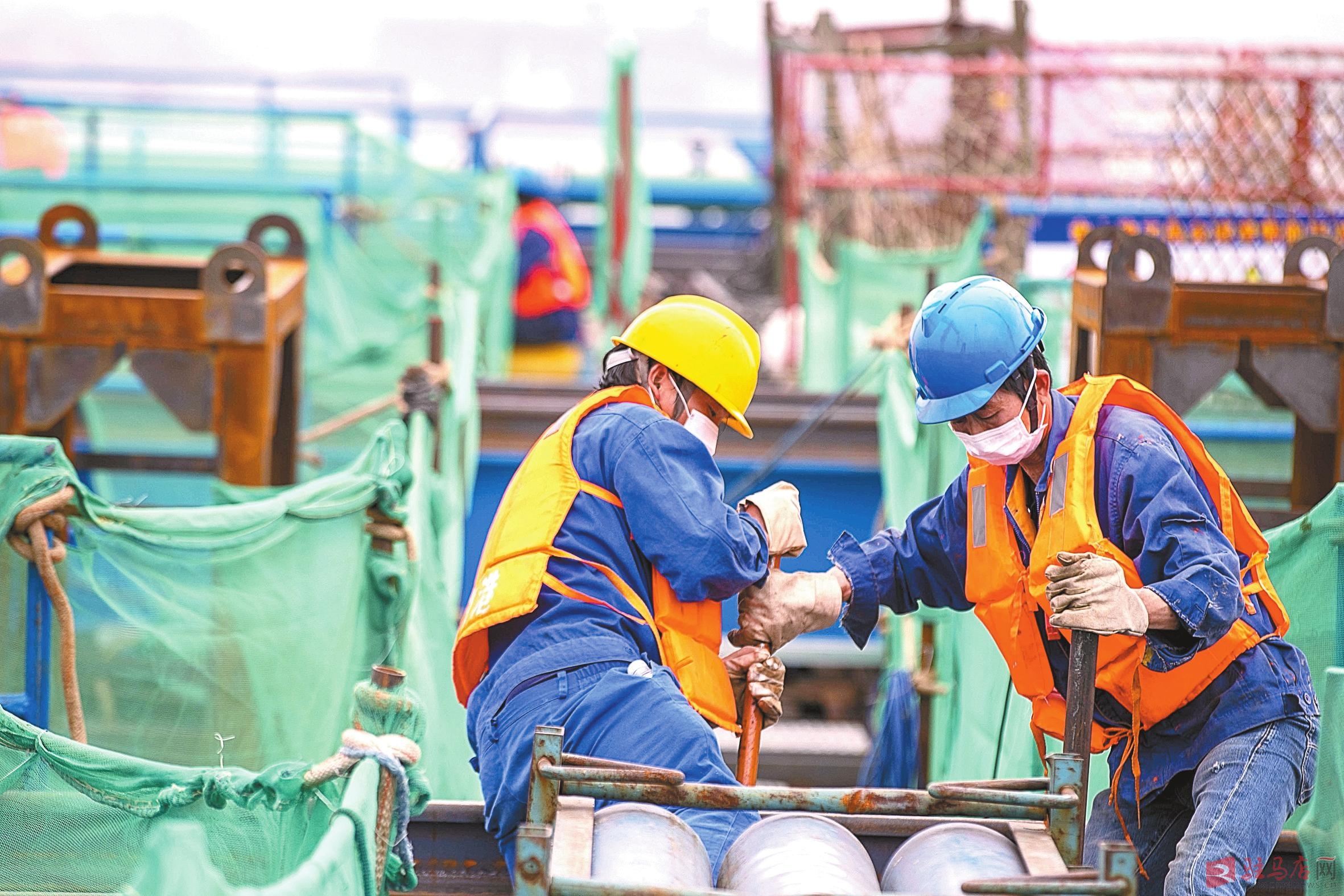 5月1日,在江苏省常泰长江大桥建设工地上,工人在调节5号墩钢沉井工作平台龙门吊运行轨道。