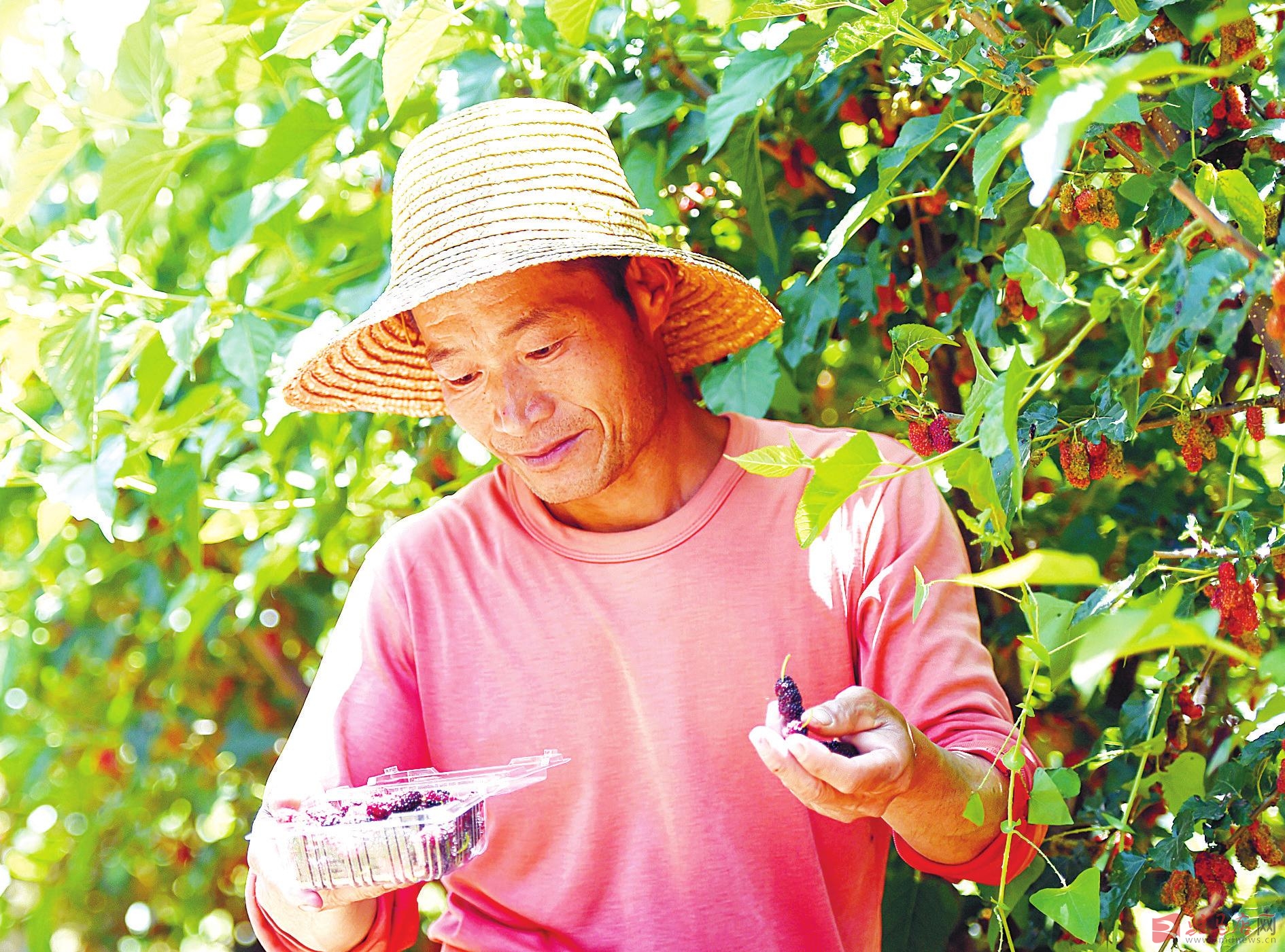 5月18日,新蔡县顿岗乡班台村合胜农民专业种植合作社的工人在采摘桑葚。
