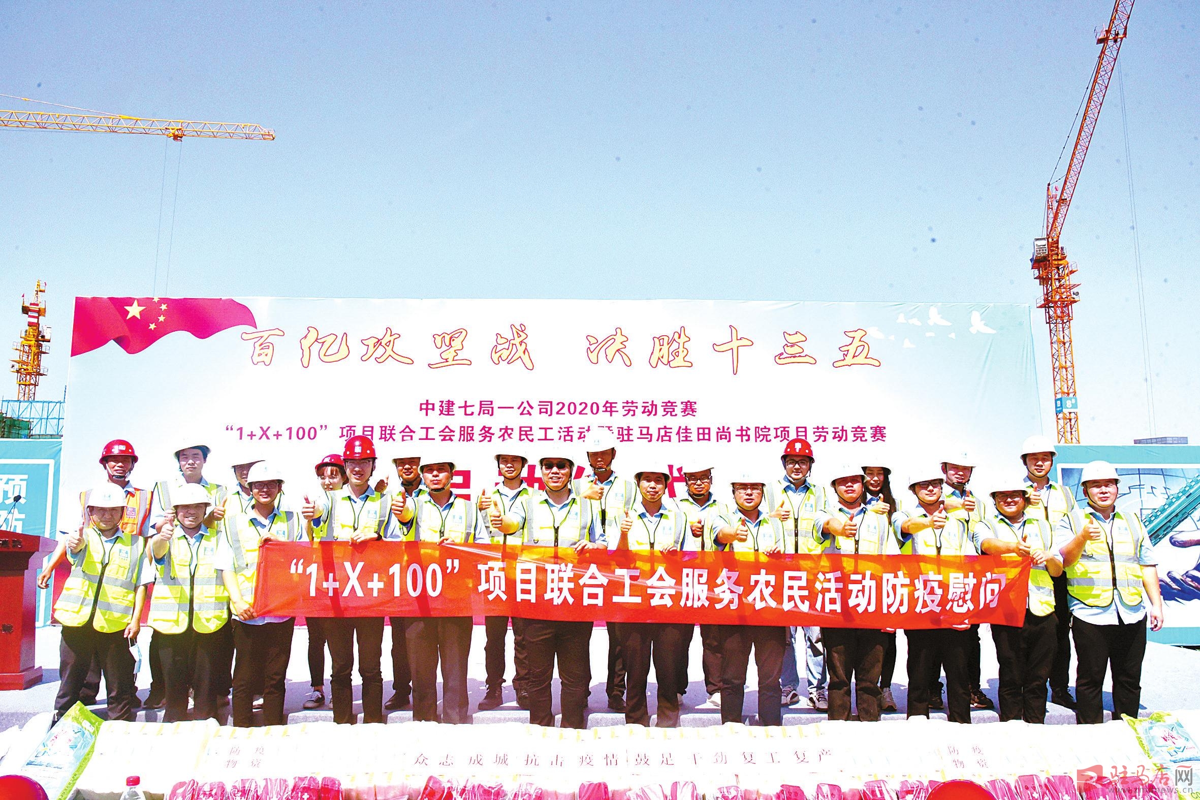 孟夏五月天,天中丰收季。5月19日上午,中建七局一公司2020年劳动竞赛、“1+X+100”项目联合工会服务农民工暨驻马店佳田尚书院项目劳动竞赛启动仪式在驻马店佳田尚书院项目施工现场举行。在疫情防控和复工复产的关键时期,为了让广大工友感受组织的温暖和抓住目前施工的黄金时间,打赢疫情防控和经济发展两大“战役”,中建七局一公司“百亿攻坚战、决胜十三五”劳动竞赛迎着夏风火热拉开帷幕。中建七局一公司、驻马店佳田尚书院项目及开发区的相关领导和广大奋战在施工一线的工友参加了启动仪式。